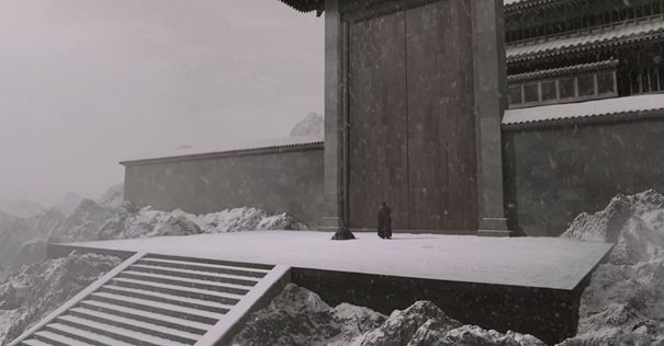 一片苍白的天地,恰值时节未见极昼夜轮替,北风倦怠稀松,呼啸而过。为了能够凸显出神庙的“神性”,我们将神庙设计的入口设计的高耸入云,用以体现传统中式的高山隐世及西式的近天奉神。