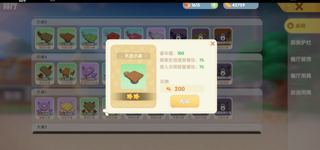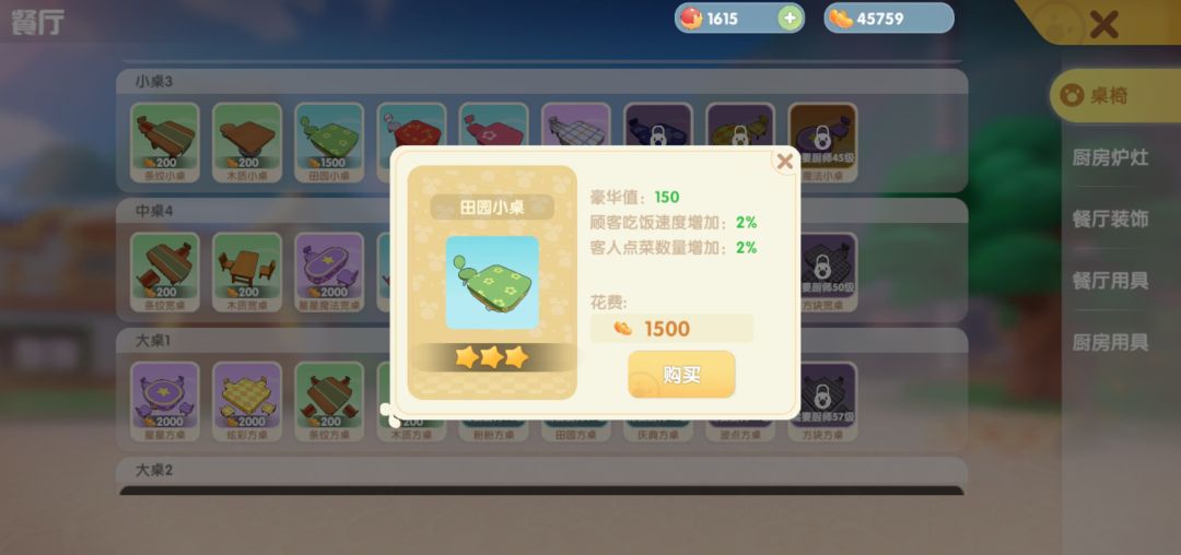而后面解锁的双桌和四人桌最多也只会加到3%,所以其实不用买那么多,一套紫色的(魔法桌)就够用了。