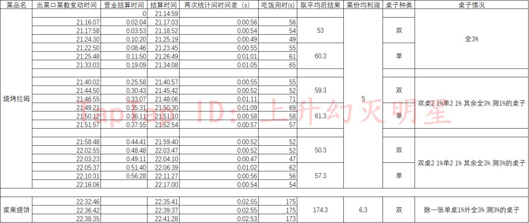 烧烤拉姆从菜品数变动到最终产生收益,单桌用时53s,双桌用时60.3s。