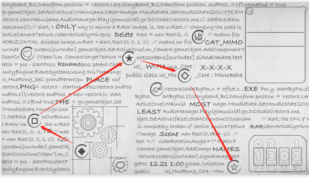 这里不难发现, 连线部分穿过了若干加粗的英文单词, 连起来就是go to the place with most names, 正好和压缩文件打开之后的若干问号的数量符合, 因此第二个提示就是: 去名字最多的地方, 那肯定是制作人员名单了