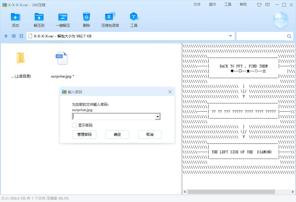 比如上一张图, 将图片对准之后发现, 菱形左侧的数字是3, 则这一张图对应的数字就是3了, 从上到下一共4张图, 每一张都对齐一遍, 能得到四位密码, 这个四位密码就是解压神秘压缩包的密码了