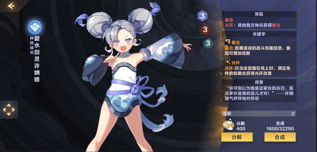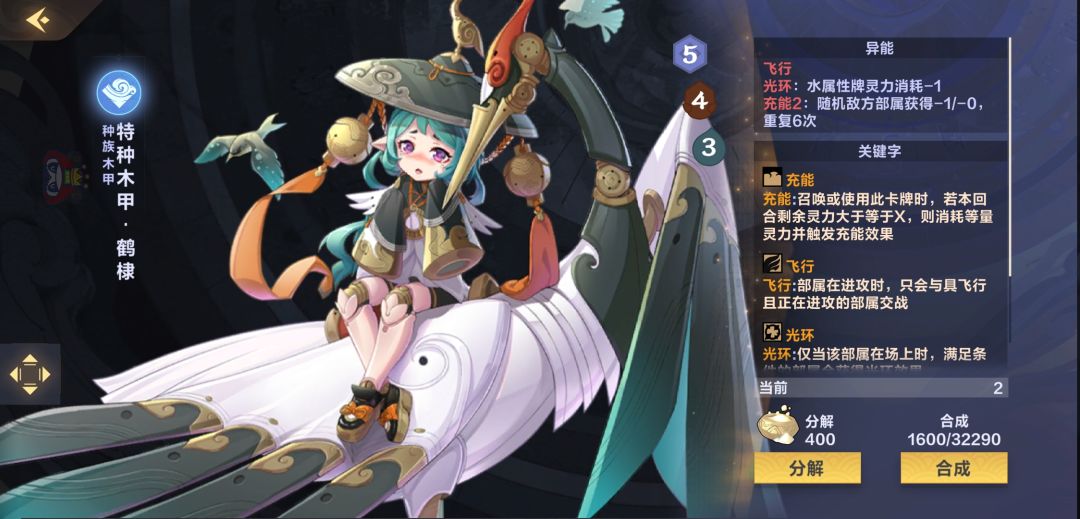 罚站水的新玩具,既能罚站又是飞行单位可以抢血,记得充能才能触发减攻效果,布阵时一定要留够灵力!!(我就经常打错导致崩盘)尤其是被【跨界之约】召唤容易被忘记需要充能,另外和【跨界之约】的充能顺序是:有多余灵力时先触发鹤棣的减攻效果,还有多余灵力则再触发【跨界之约】的回手效果