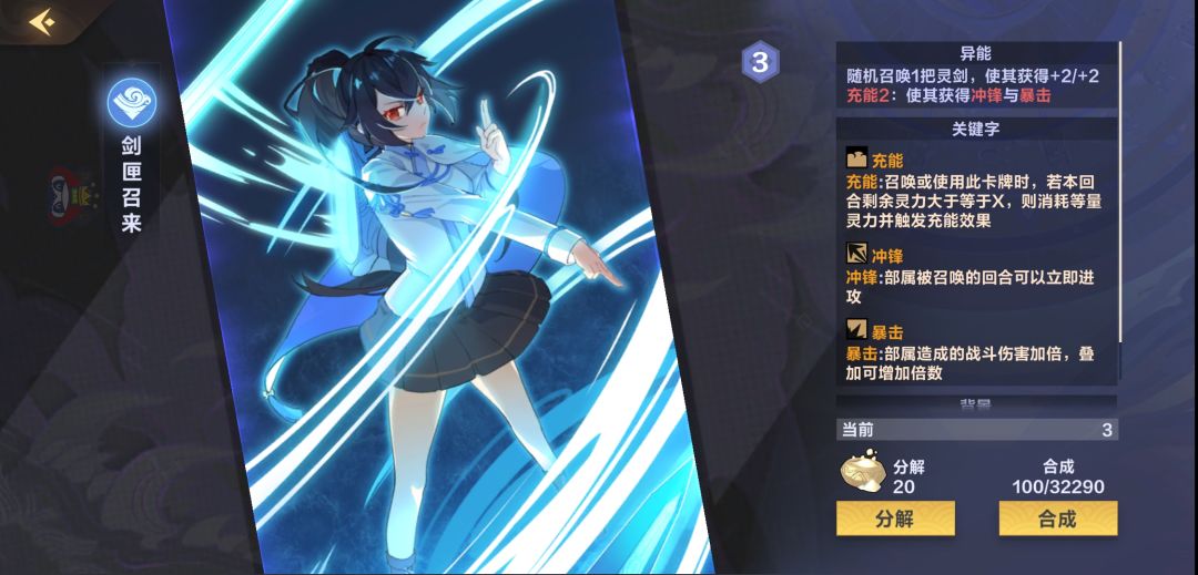 个人觉得是新版本设计的最好的卡,有强度,不离谱,思路新颖,组合很多,在罚站水里肯定是配合【剑香花语沈歧】全场-2/-0,并且提供一个444的飞行剑,假如脸黑沈歧在手上,可以6费打出,召唤充能的【特种木甲鹤棣】随机-1/-0重复6次,要注意有多余灵力会触发充能回手,布阵时注意自己的灵力状况