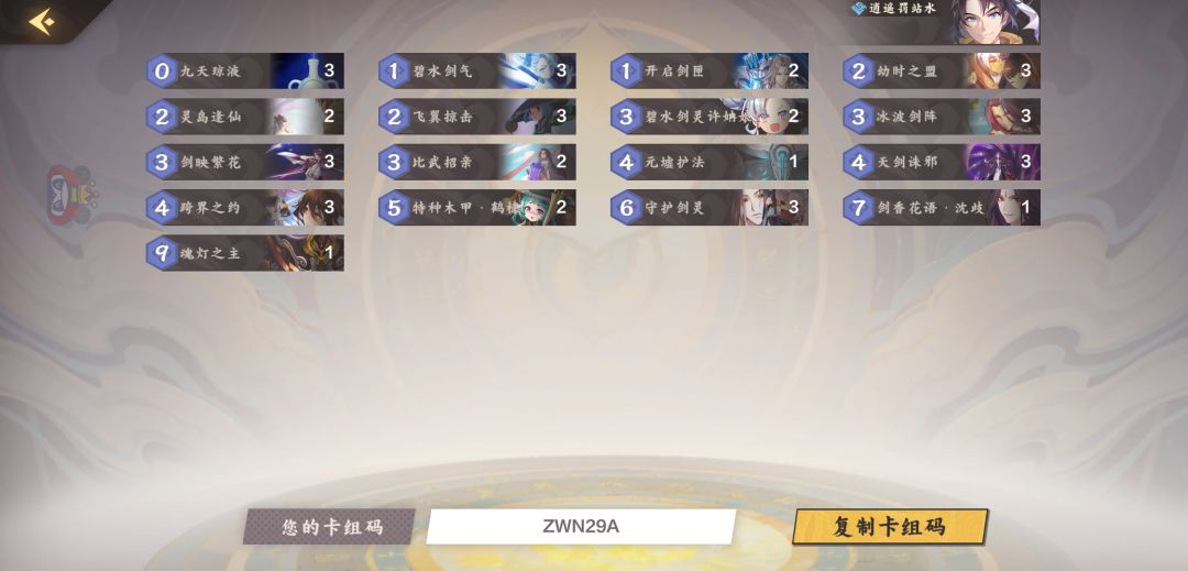 主要是后期抢血并冻住对方部署守住一路,前期3点伤害容易把小部署打死了无法达成卡场,也可以3费直接打抢血互爆,有了这张卡,水的直伤法术算是勉强够了(碧水剑气3×2+飞翼掠击3×3+天剑诛邪3×4=27)一般打到后期有【守护剑灵】和【幼时之盟】的过牌能抽到三分之二的直伤卡加上飞行单位和李逍遥的大招和魂灯勉强能打死