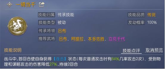 汉尼拔一技能推荐一骑当千,首回合让汉尼拔获得连击状态,且降低受到物理和谋略攻击的伤害。满级的一骑当千,普通攻击会100%对该目标攻击2次,一骑当千的连击状态和减伤可持续2个回合。