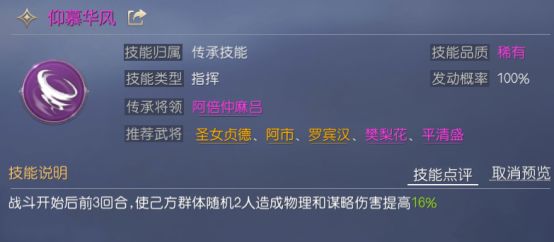 美尼斯二技能推荐仰慕华风,这是一个比较全面的增幅技能。因为该阵容中有2个谋略将领和一个物理主C将领,携带仰慕华风可以同时增加物理和谋略伤害。