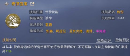 虞姬二技能推荐奇谋良策,虽然虞姬自带技能很强,但是只有40%的发动概率,而尼罗河馈赠也只有50%发动概率,都不是很高。想要发挥出这两个技能的最大作用,就需要增加其发动概率。而奇谋良策以降低虞姬自身50%治疗效果为代价,换取两个效果,还是很划算的。一个是自身受到的伤害降低50%,另一个是提高20%主动技能的发动几率。