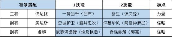 该阵容中,汉尼拔为输出核心,携带的技能也是以输出为主。主将携带的两个技能都是首回合获得增益状态,搭配美尼斯可让汉尼拔优先行动,且美尼斯携带的两个技能可继续增加汉尼拔的伤害,使其打出更好输出。虞姬是辅助位,和美尼斯辅助位不同的是,虞姬提供伤害加成的同时,恢复队伍兵力。