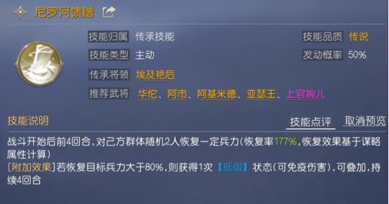虞姬一技能推荐尼罗河馈赠,单靠虞姬自带技能的恢复效果,不能快速恢复兵力。携带尼罗河馈赠在前四回合可保证我方阵容的生存能力,以较多兵力打出不错的伤害。该技能提供的抵御效果不仅能保护前排,还能保护主将。