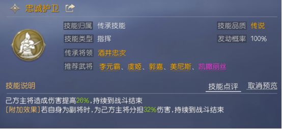 美尼斯一技能推荐忠诚护卫,当主力输出成为主将时,忠诚护卫就是不错的辅助技能,不仅可以提高主将造成的伤害,还能为主将分担伤害。满级的忠诚护卫可以分担50%的伤害,这个附加效果一直持续到战斗结束。