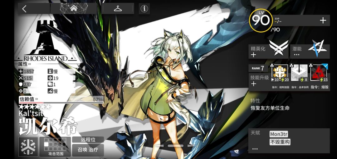 精0时,凯尔希获得一技能:指令:结构加固和天赋:Mon3tr(可以召唤Mon3tr协助作战,m3拥有一定攻击和防御,再部署时间为35秒)