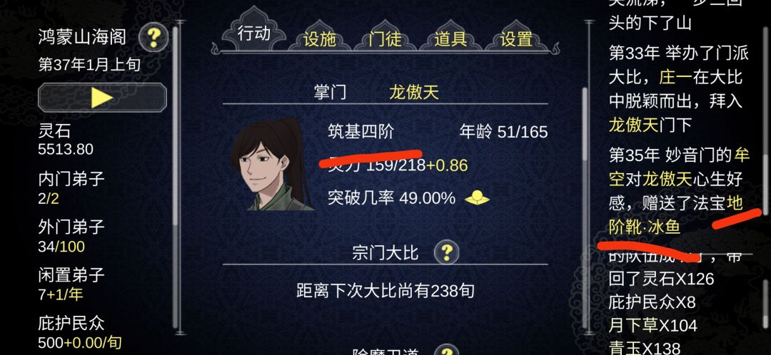 建立宗门后,就是一边除魔卫道,一边手动采药采矿,要记得炼回武力的丹(不能停)。有足够的矿就去炼器,不要多,3,4把就行。然后在第一次宗门大比之前把丹峰搞出来(一定要第一个,别的不急)。