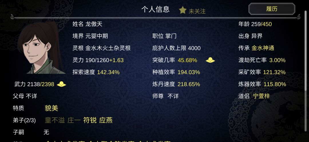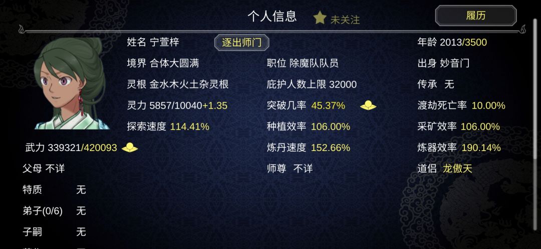 大比结束之后,管他第一个弟子什么牛马,直接收了,到后山(丹峰)当丹阁阁主,不要选峰主,然后炼第一个丹。让他一直练,你去一直除魔卫道。这时候就不要手动炼丹,采东西了,只要手动练器就好了。如果第一次大比到第二次大比之间你收到好一点点的法器了,就在快要大比之前把那个工具人的装备取下来,不要直接点卸下装备,记下他的法器是什么类型的,去道具里面找,然后点没收,再把他逐出宗门。(如果工具人是双灵根及以上,或者有好一点的天赋的可以留着,等他筑基了再用他收徒。)逐出弟子,弟子好像是100百分百入魔,如果修为比入魔弟子低有低几率被偷袭(减少武力值,不是武力值上限),只要逐出的弟子灵根不是太好都问题不大。