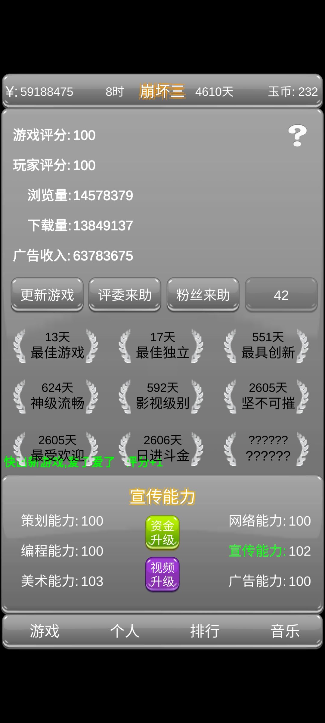 我玩了大概30个小时了,还真让我玩出bug来了,这游戏的数值到了100以后就升级不了了,我就当他100封顶,但是下一天的看广告可以突破极限,101往上走,排除彩蛋那肯定是bug了,作者可以看看。