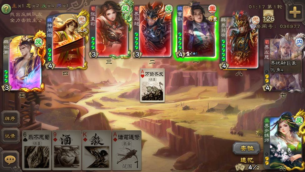 6、技能也可对队友使用,比如装备区有狮子,或者ak、贯石斧、寒冰剑、丈八等装备给到合适的队友手中(低配的界香?哈哈哈)这些武器的本命武将我想无人不知吧,合理分配也是界步的能力之一。