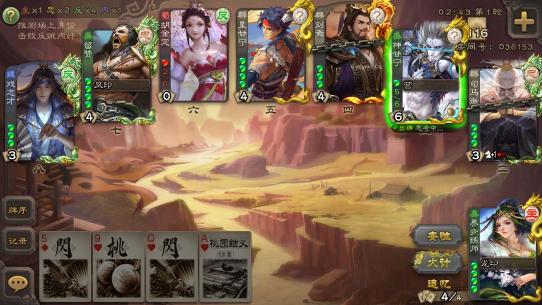 2、学会看身份,快速确定敌我双方的核心武将在几号位,(1)如果己方核心在你后置位,大可让他去拿主忠方核心武将的牌,等他等回合来个爆发争取推掉敌方核心。(2)如果敌方核心在你后置位,先让己方核心拿他牌,然后你再输出,这既可以加强队友回合外防御,有可削弱敌方防御。(一个宗旨:增加推掉敌方输出核心的可能)