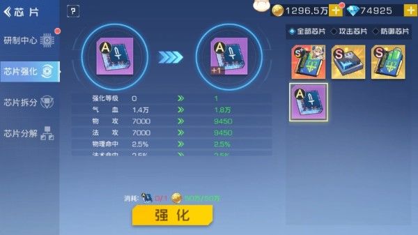 只有A级及以上等级的芯片才能进行强化,芯片强化A级及以上等级的芯片拥有技能效果。橙色强化不仅能提升芯片属性还能加强技能效果。当芯片强化到+3、+6、+9时,芯片能获得额外技能效果。