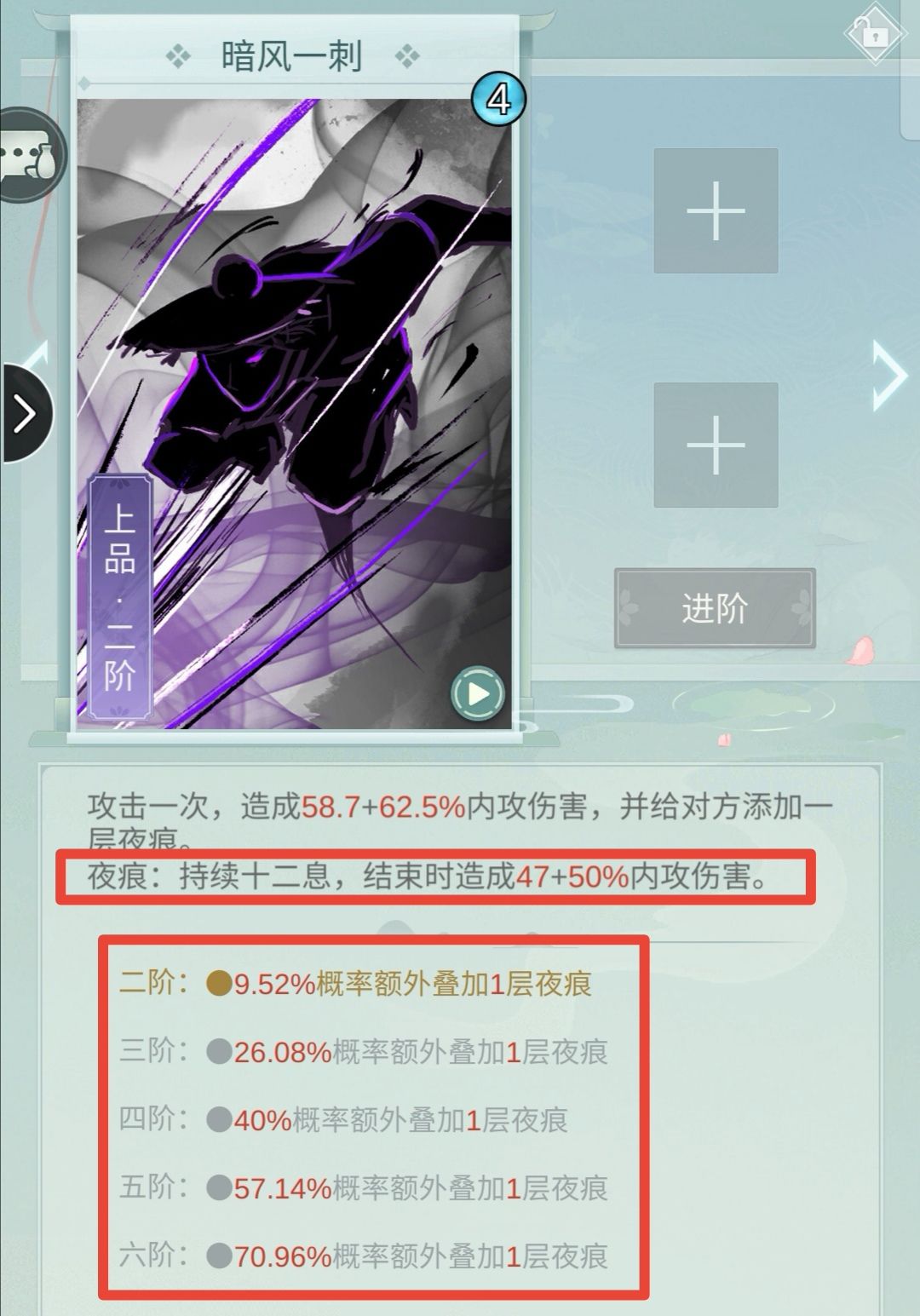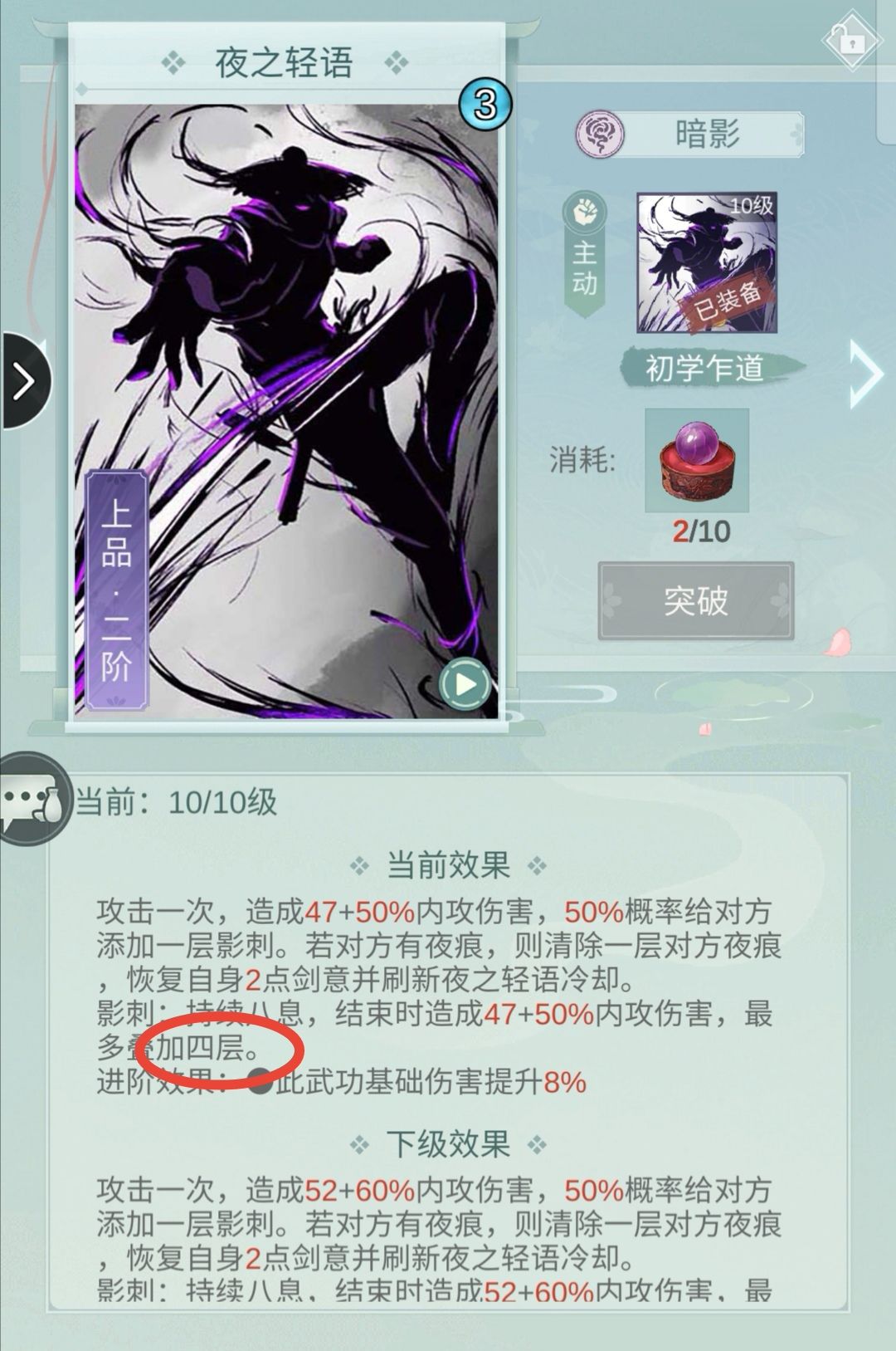 “影子替身”加强了1息,更易触发且加“夜痕”,“暗风一刺”(暗刺)进阶是概率加“夜痕”,那么“暗刺+夜之轻语(轻语)”双连更加平滑。