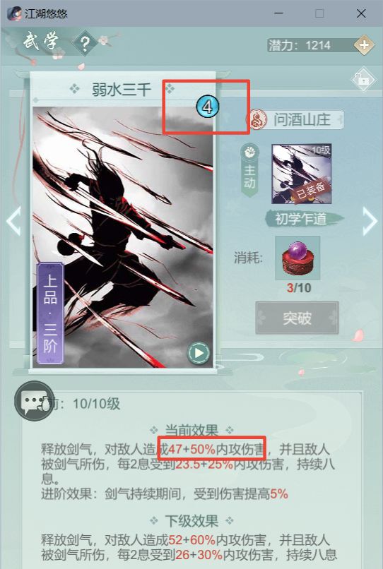 ③整体评价:问酒更专心自身武学了,弱水三千,蛇刃开峰带来的剑意需求下降,梓落的“寒意”破定需求上升。