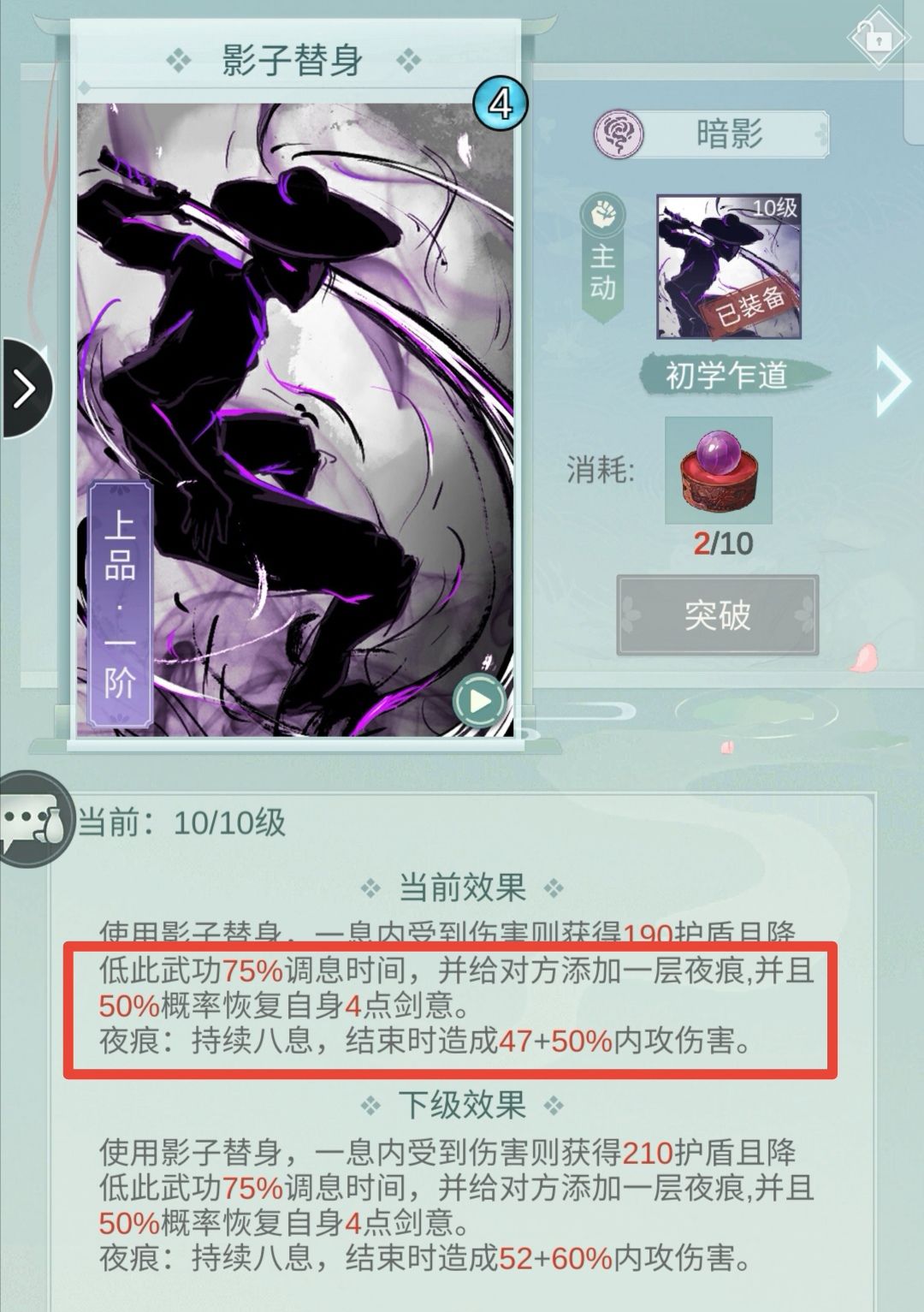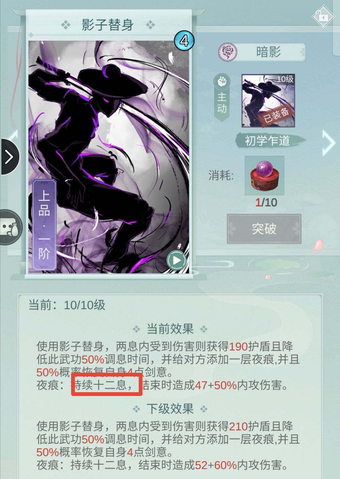 “影子替身”调息时间变长,叠盾上限减低,身板会更脆。