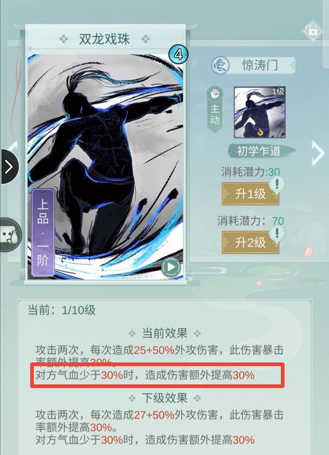 ①好:“双龙戏珠”,多加30%血线下,增伤30%,配合剑伤+三层剑势,癸水剑意,可勉强一用。