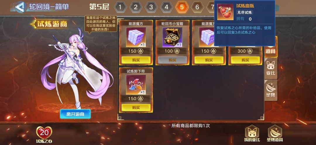 ⑶学会利用试炼之心提升伤害:5个试炼之心能提升一局的伤害,中途一些关卡可以恢复试炼之心,但别都用,没了,就退出试炼了。(还有一个能直接胜利的道具,难打的关卡可以用一下)