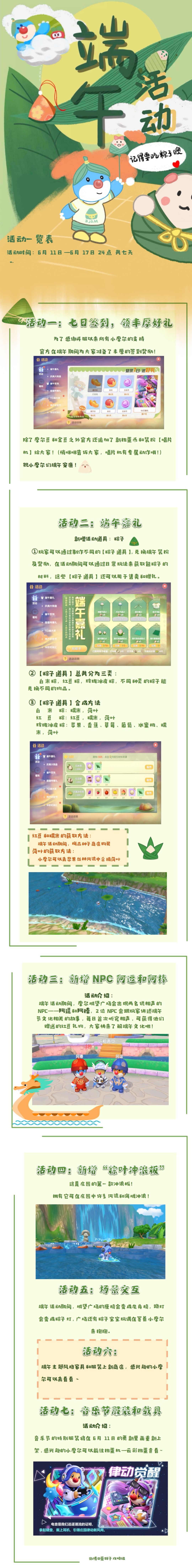 ①玩家可以通过制作不同的【粽子道具】,兑换端午装扮及奖励,在活动期间可以通过日常玩法来获取包粽子的材料,这些【粽子道具】还可以用于售卖和赠礼。
