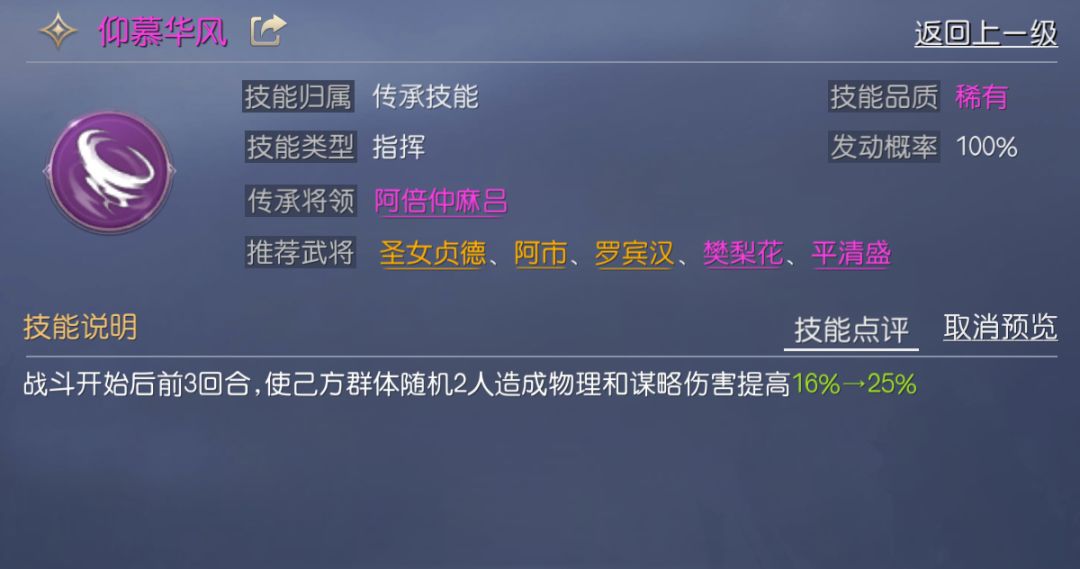 当统御达到16之后便可以加入1名满红紫将作为过渡,建议以医师类或辅助类为主,如樊梨花、上官婉儿、阿倍仲麻吕都是非常不错的选择,他们的技能大多在满编队中也能使用,此处正好补缺将领位置,也能减少1个技能的消耗栏。