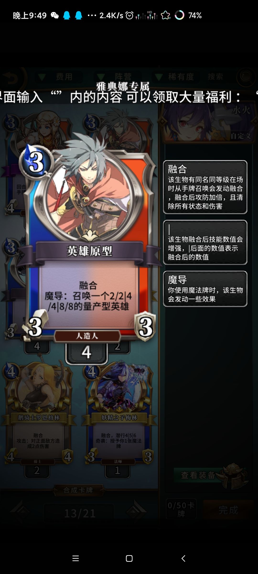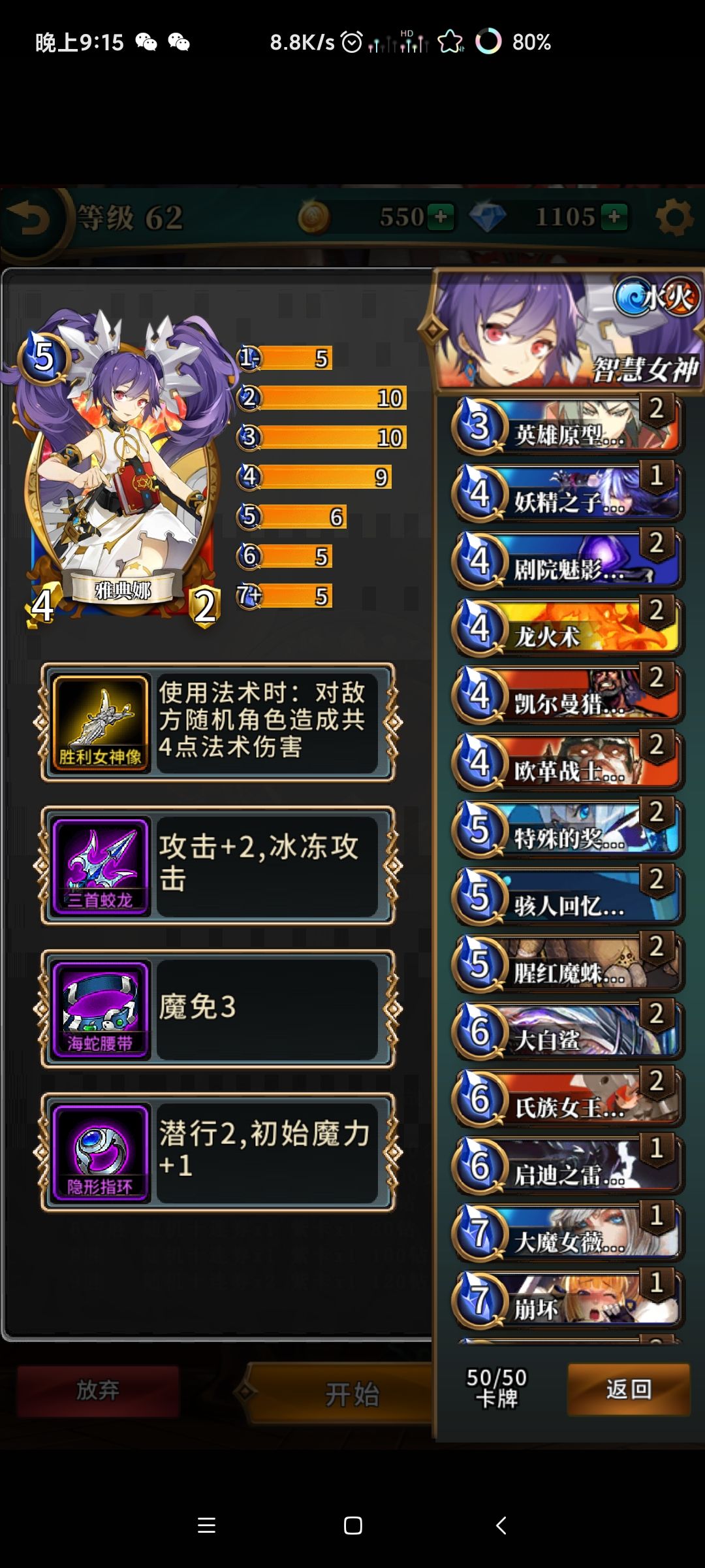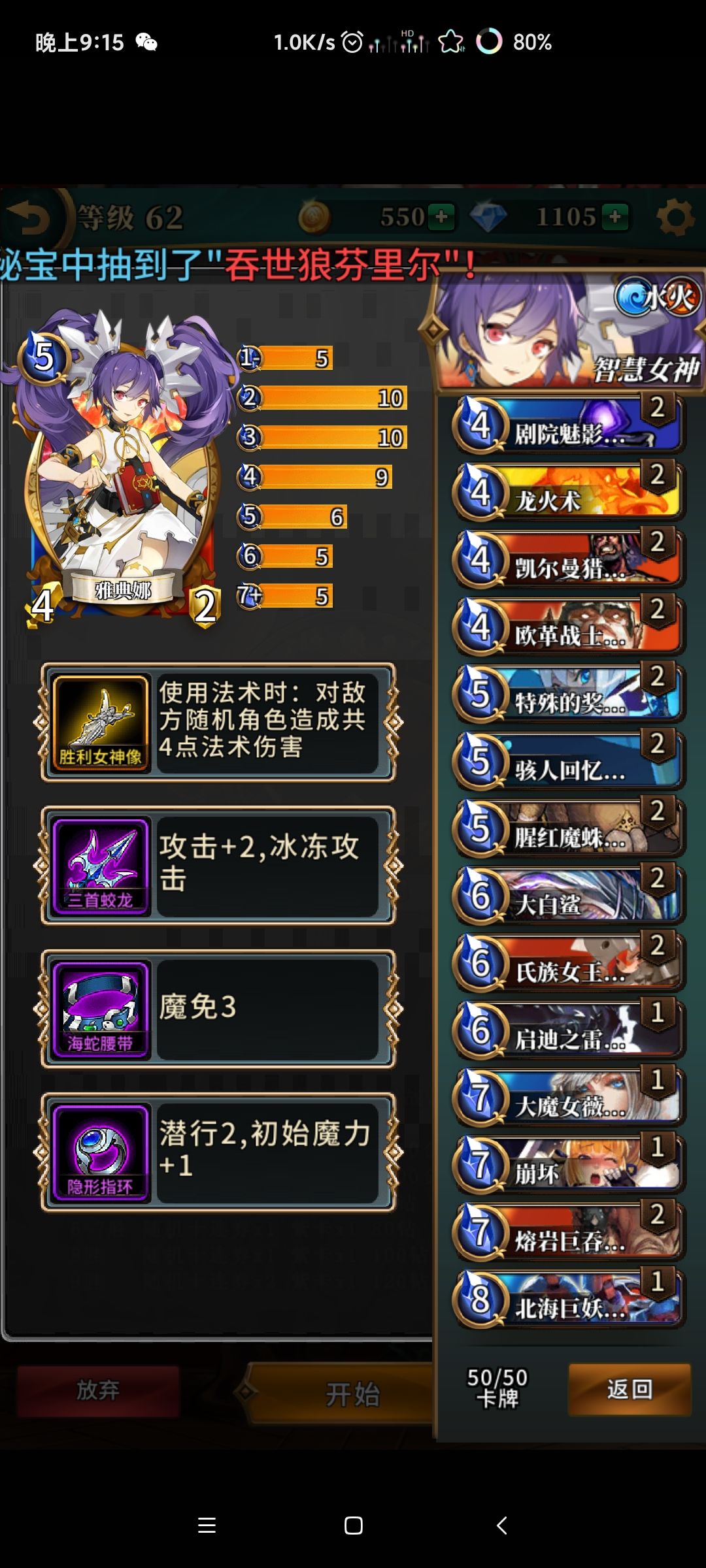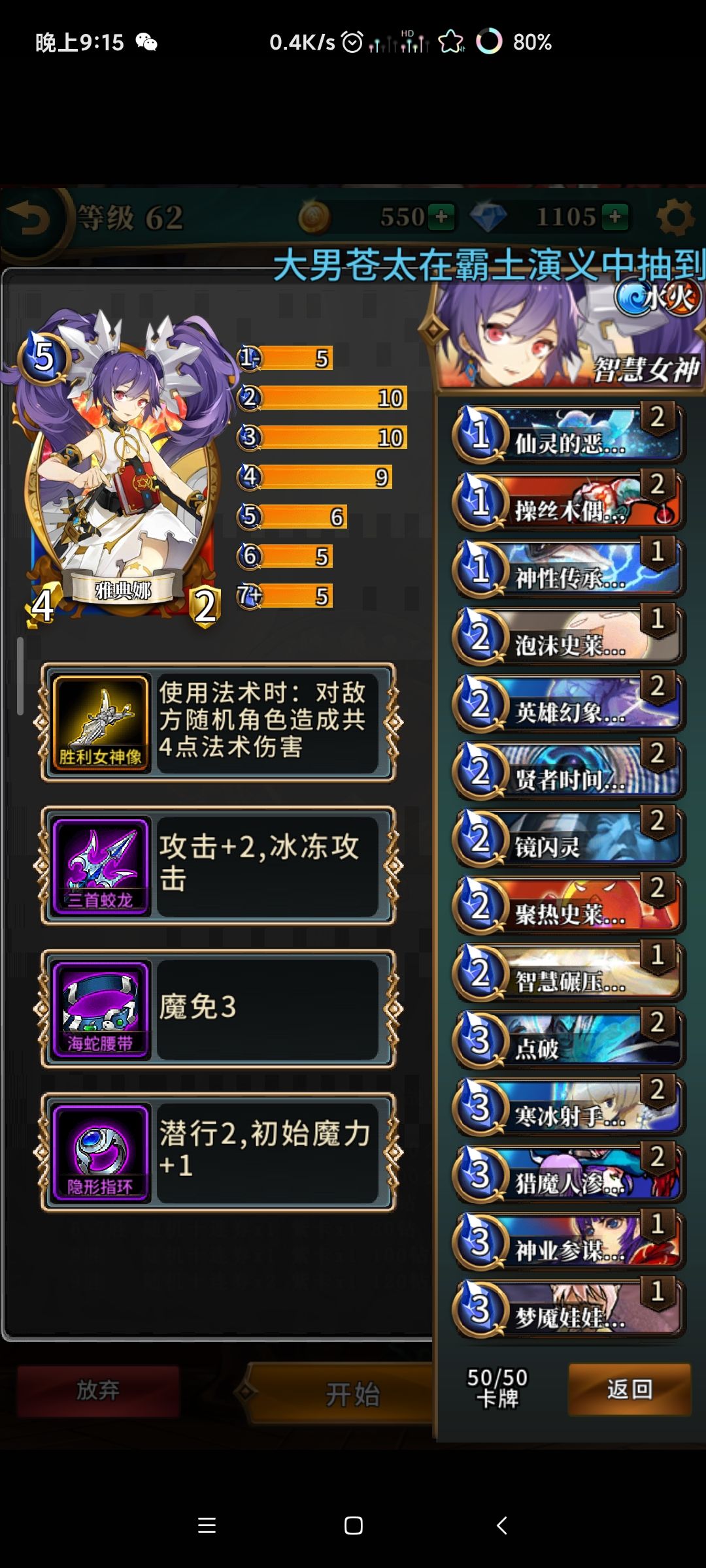 如图所示,英雄选择带胜利女神像的雅典娜,以英雄卡为核心的打法构建卡组
