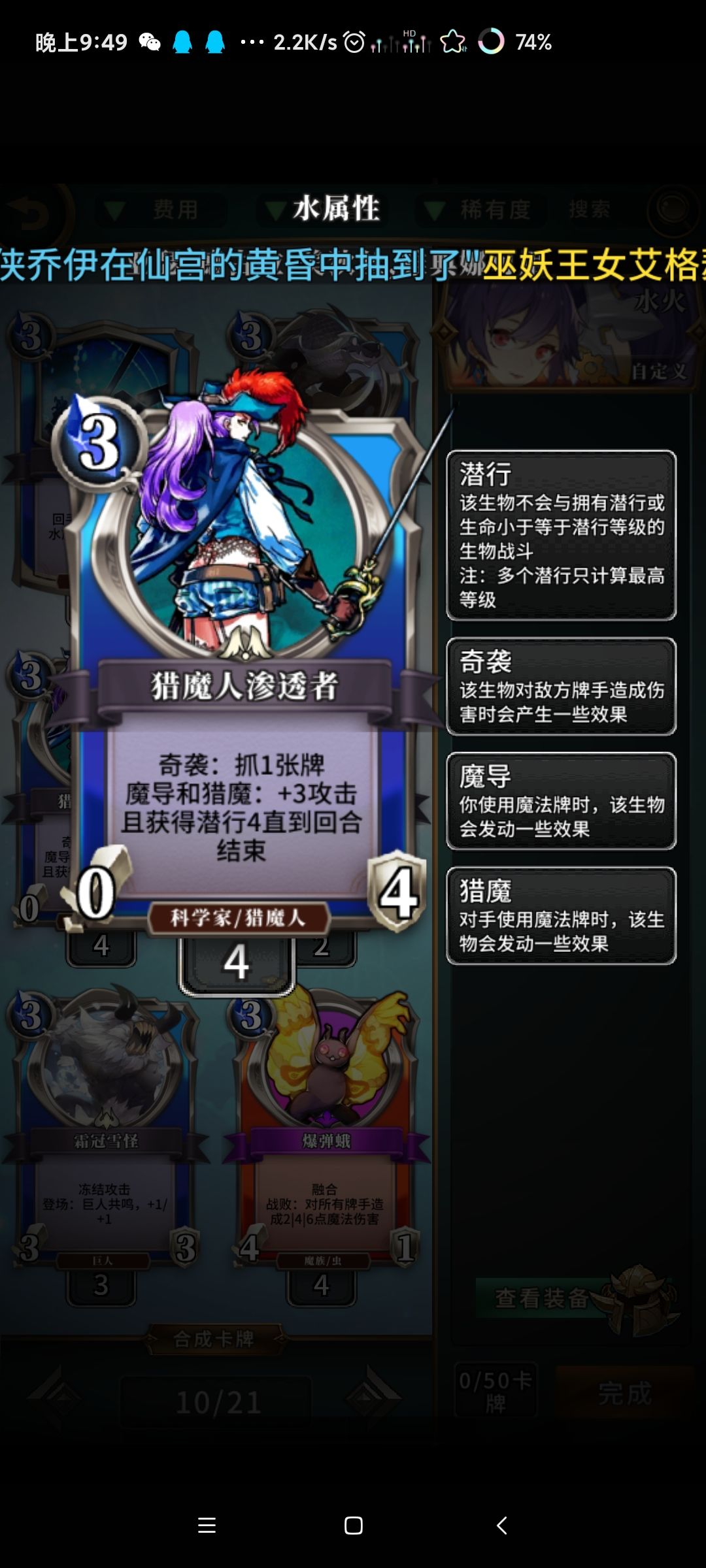 猎魔人渗透者,5分,4点的潜行配合其过牌效果放在后手位很强,过牌核心,或是配合法术卡养攻击力进行斩杀,缺点是过于依赖法术的配合,没有法术牌容易白给