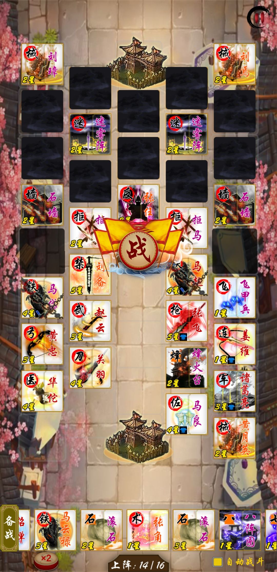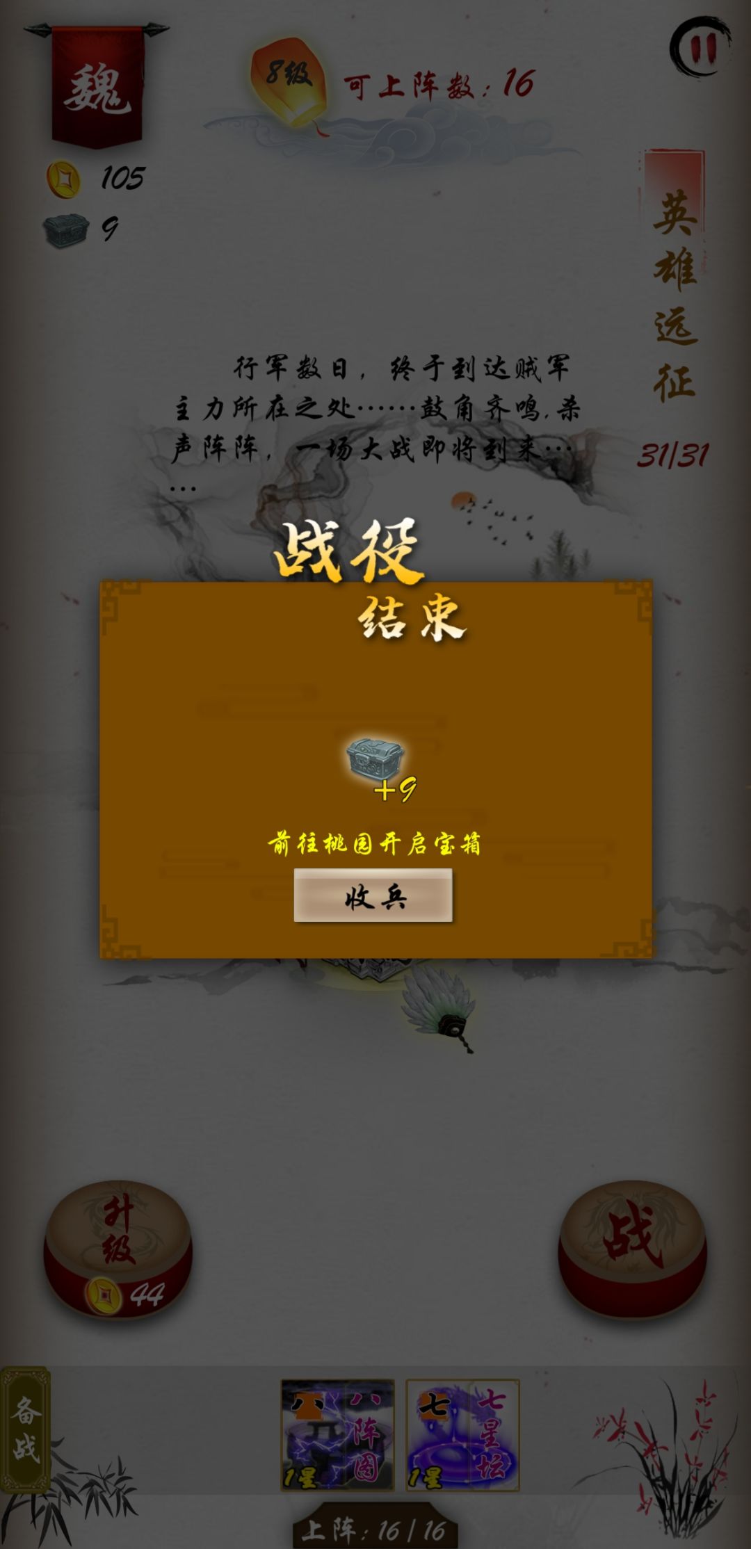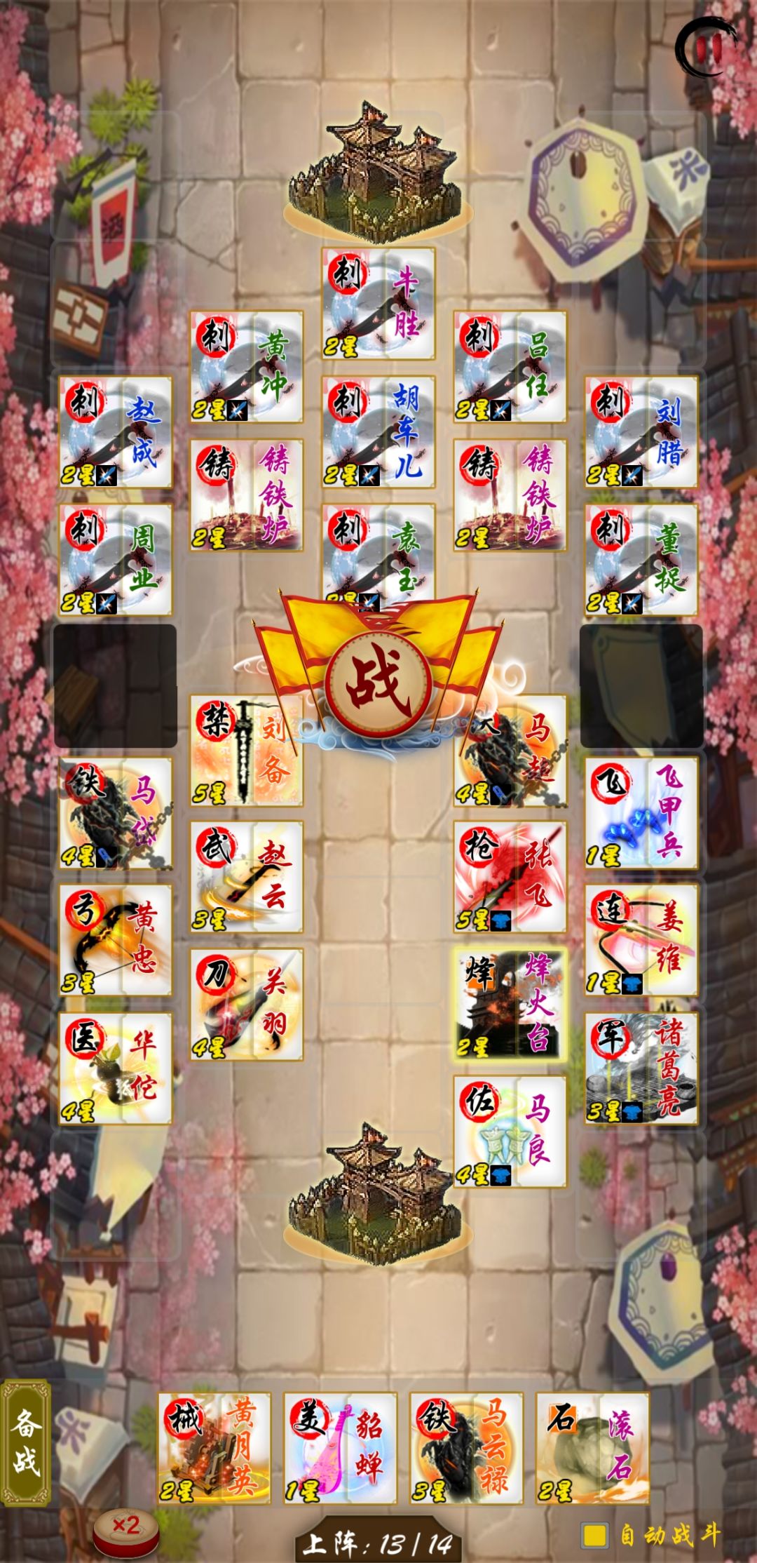 12关,第一个红箱子关卡。刺客关,很容易减员辅助的一关,其实这关刺客优先级别我也没太弄清楚,有时候打黄忠有时候华佗有时候马良。但因为才12,我觉得一轮秒不掉我黄忠或者华佗,所以我给马良补了个防御建筑(如果实在没有,那就听天由命吧)运气较好,无减员过关。
