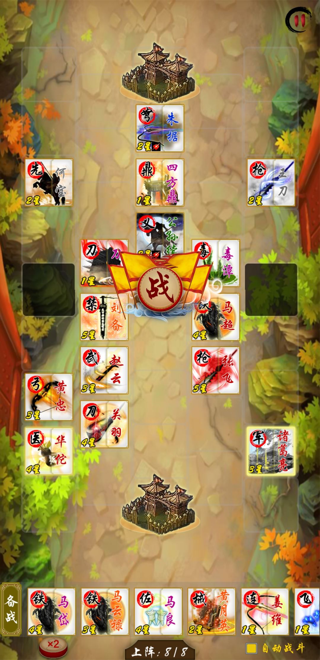 开局站位。需要注意的是,如果刘备练度不够,或者脸黑碰到运气爆表的张辽或者吕布,刘备很可能会没 如果担心这个问题,可以在刘备位置放其他非马超铁骑,刘备补在马超位置(主要反击伤害还是很可观 现在这个位置挨打的比较多 有华佗和马良双辅一般不会死)