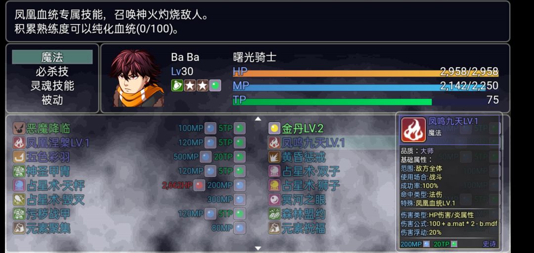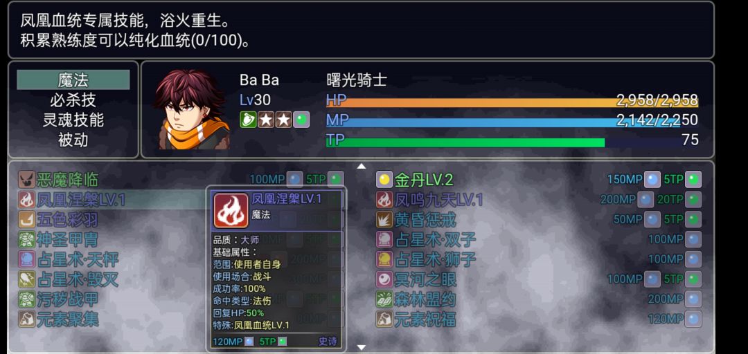 顺便要注意的是凤凰血统技能在魔法栏,如果职业不能用魔法就用不了血统技能