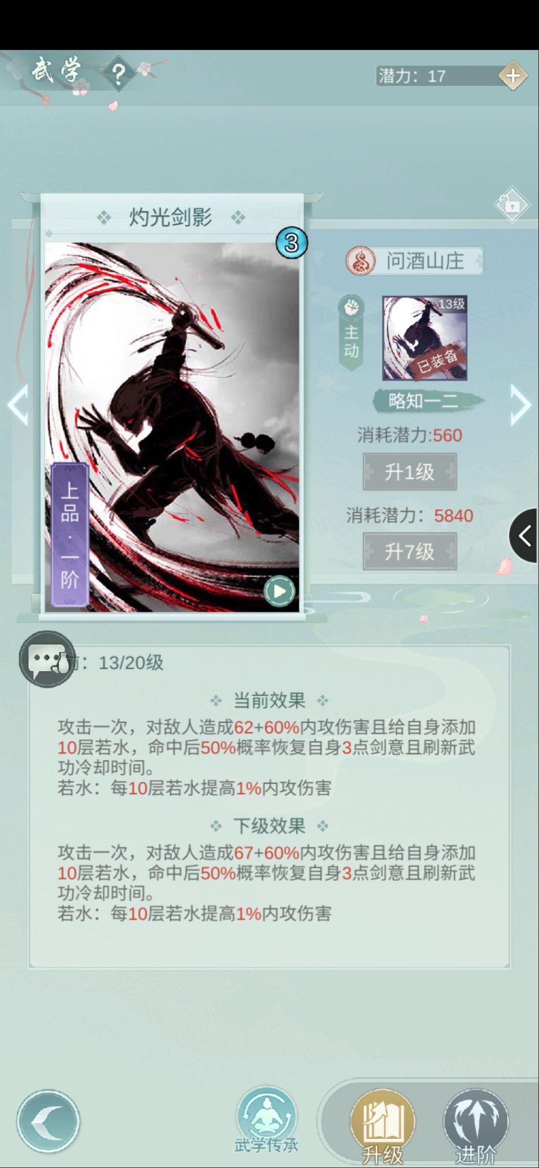 1.针对内功防御较差的外功门派,开局灼灼灼,叠加若水,挨揍不要怕,剑意好了就弱水(本身消耗三点,每一个回合会留一点积存)。在70层左右如果剑意没了。等一次普通攻击留下四点剑意准备。最后的10-20层数靠对面攻击等到100层时,弱水三千加剑魂凝神。