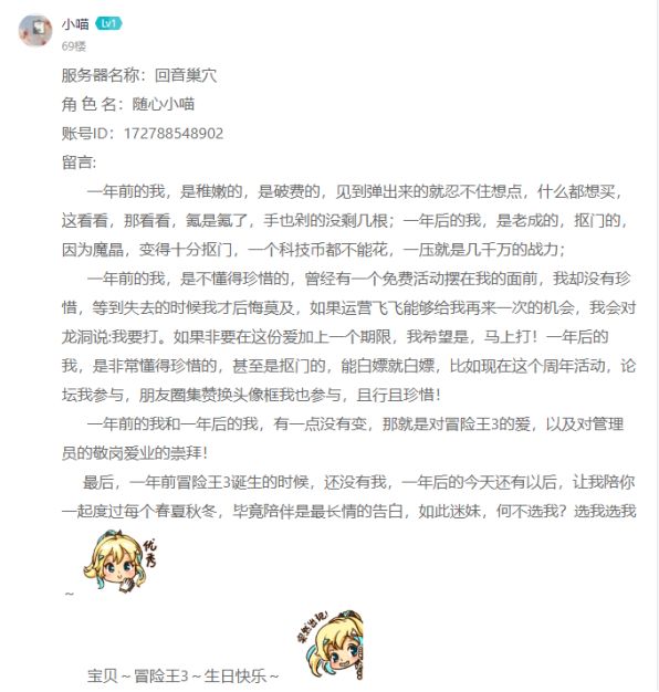 十分感谢大家参与我们周年庆的线下活动,在飞飞的辛苦整理下,共计发放了几千份周年限定礼品和限定称号等奖励。这一年里,有太多的欢笑和喜悦,也有太多的汗水和热血,来看看这些冒险家一年以来的感慨吧~!