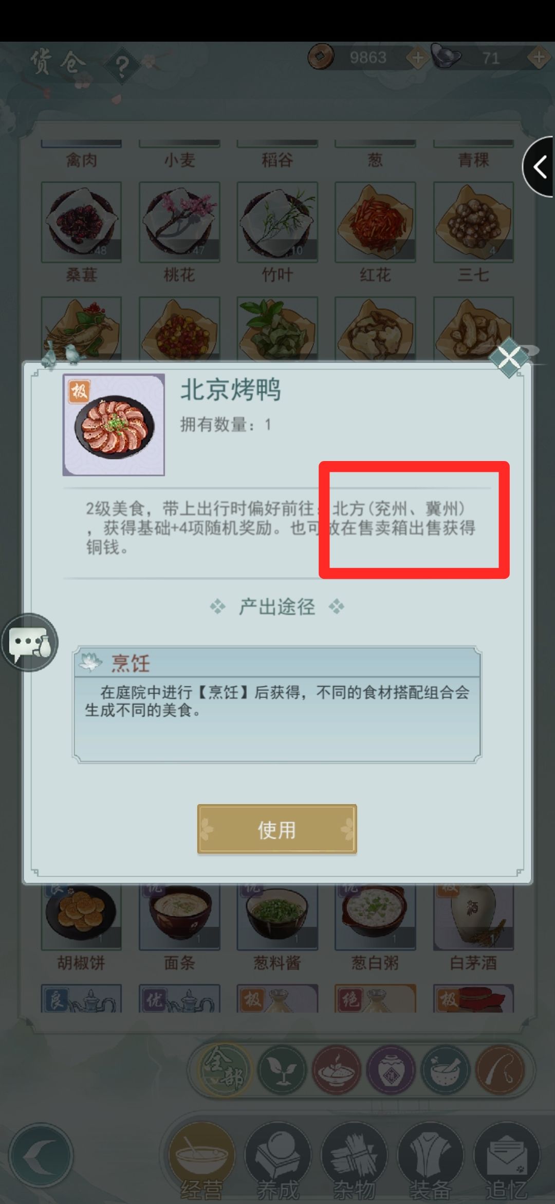 我们在仓库点开食物界面就可以看到它可以带你去哪里,去兖州的食物很多,烤鸭炒米等等,其它门派同理