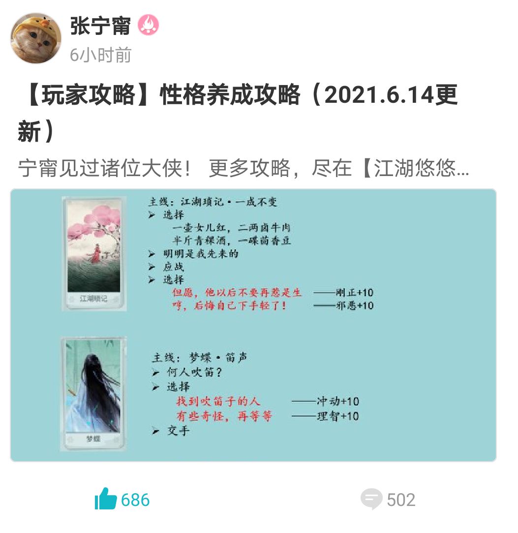 在这里非常感谢@张宁甯这位大佬的帖子,让我我们可以在触发侠道事件时即可根据想要的性格触发对话