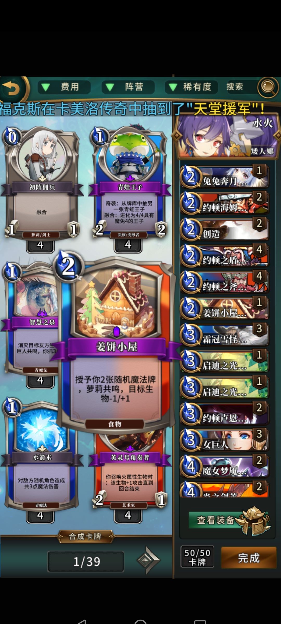 开局找两个小矮人和巨人,对面没解的话,然后等着两个矮人单刷吧。第二点就是本体滋水了,姜饼小屋、创造既能触发法术还能补牌。经常给天启现在