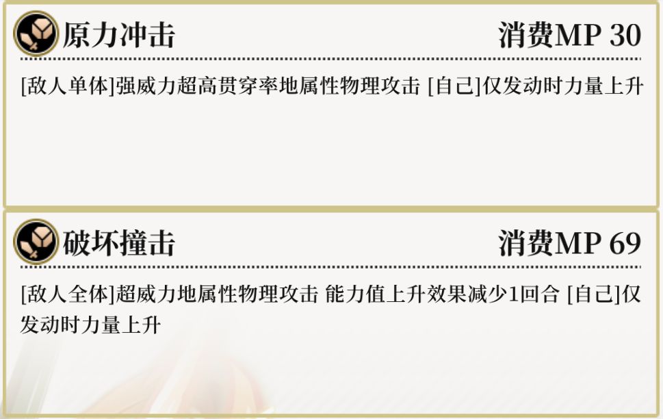 另两条技能均为输出型技能,【原力冲击】可对敌单体造成高几率贯穿伤害;【破坏撞击】则针对敌群体造成超威力属性物理攻击,同时减少敌方能力值强化效果1回合。