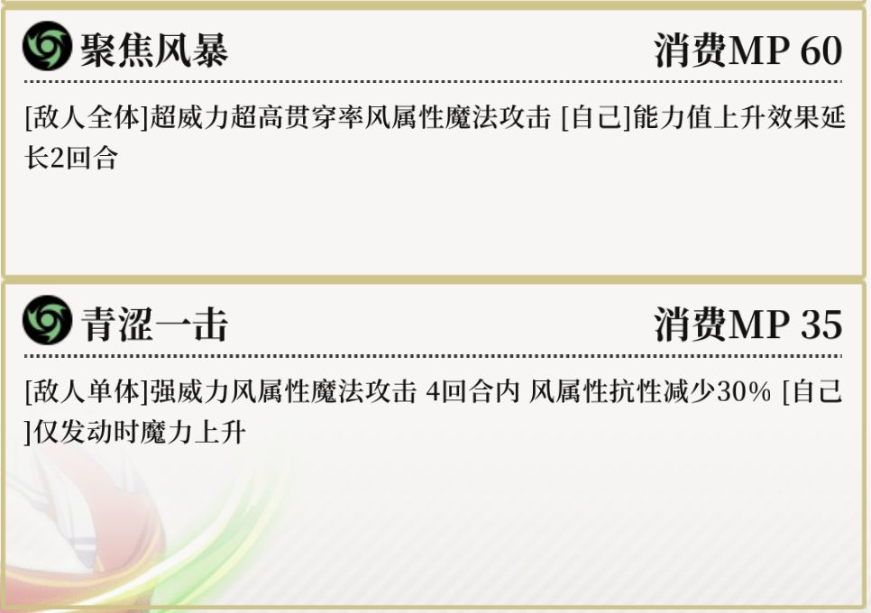 特技【降世神通】为速攻暖机技能。魔力&风属性双重伤害提升50%,先手和强力攻击在某些场合十分有优势。