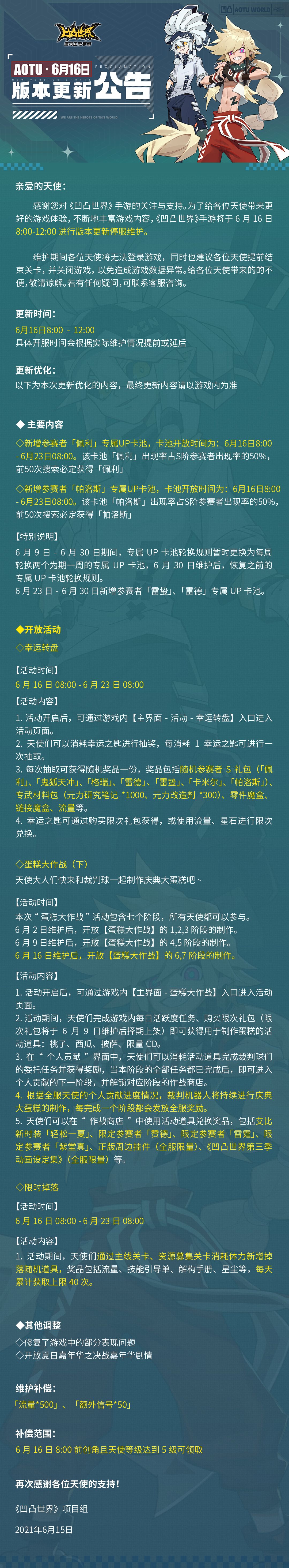 《凹凸世界》手游6月16日版本更新停服维护公告
