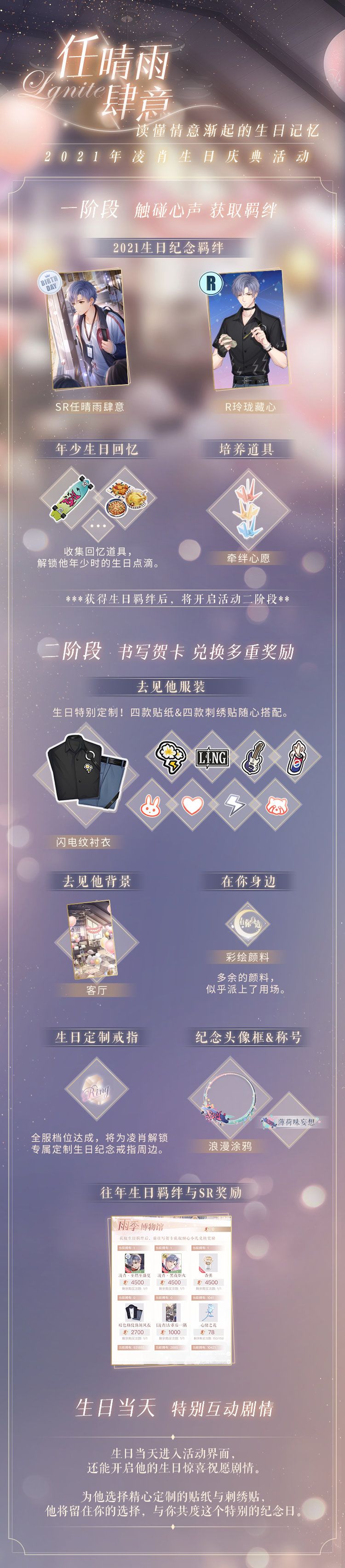 二阶段累计祝愿达指定次数,可领取【生日定制服装、去见他背景、在你身边】等奖励。