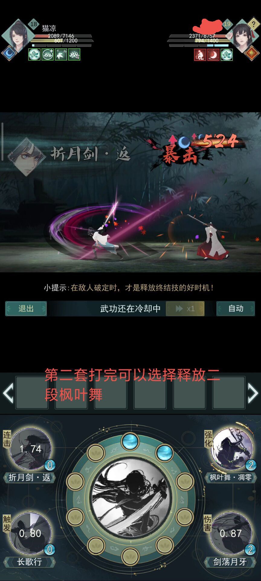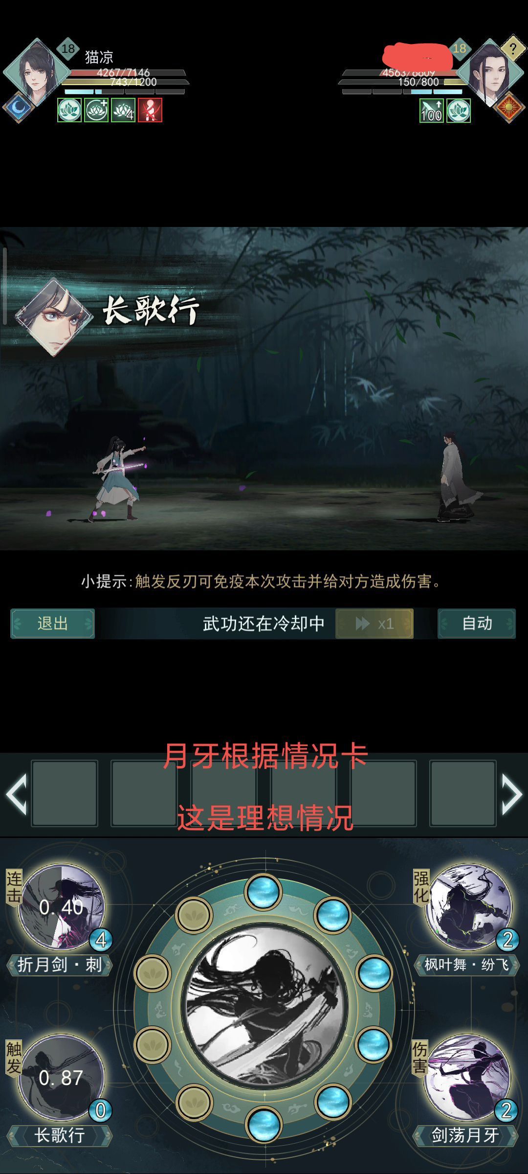 之后等到对手攻击完,释放折月剑--长歌行--月牙(长歌行第一回合要卡好)。