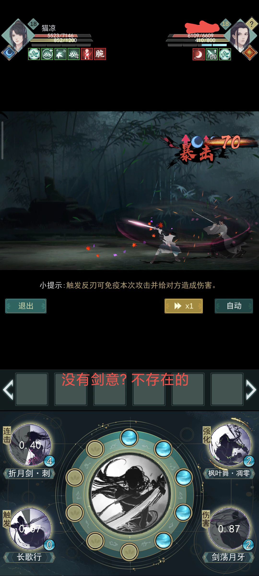 最后等对手行动完释放折月,800定力已破。问酒,暗影斩杀。1000以上定力的,你枫叶舞的速度加成足够你在对手获得剑意前行动。按套路再来一套即可。