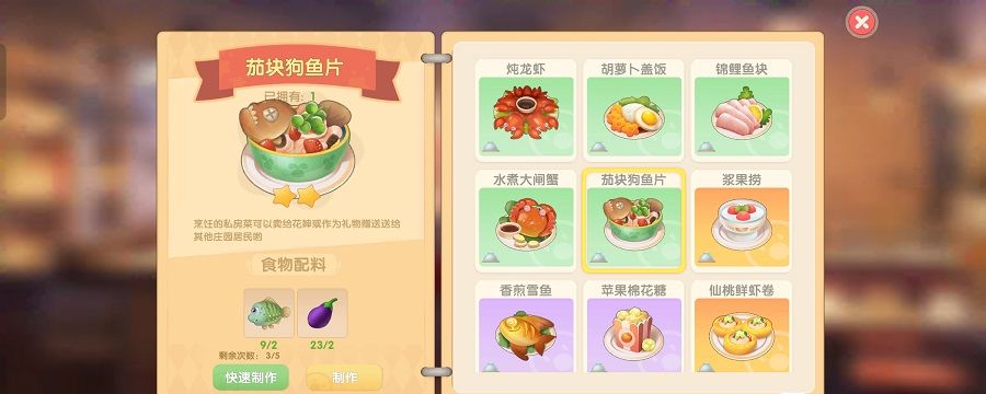 狗鱼可以制作成茄块狗鱼片。制作方法:狗鱼×2+茄子×2。火候:中火。料理品级:2星。制作等级要求:需要厨师等级达到5级或以上才能制作。
