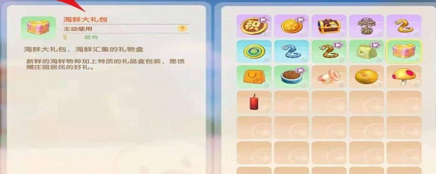 海鲜大礼包作用:海鲜大礼包主要可以用来作为礼物道具赠送给npc居民来增加好感值。可以将海鲜大礼包赠送想要提升好感值的居民,一次增加20好感度。
