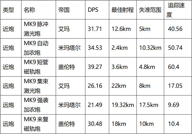 在中型火炮的对比中,我们不难看出,艾玛帝国的伤害较为平庸,其远炮与近炮之间的差异也没有其他帝国那么大。最主要的还是激光炮的追踪速度,即使是近炮的追踪速度也仅有40.56,这就导致大部分艾玛的巡洋舰难以进行近身肉搏战,或许是因为这一原因,艾玛帝国的舰船在速度上略微快于盖伦特的舰船。