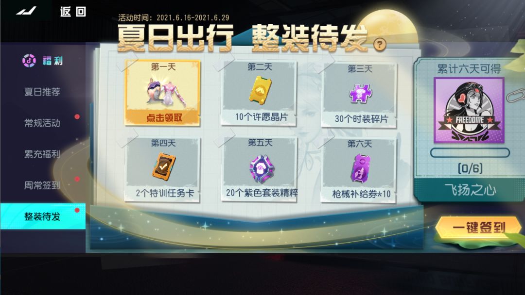 活动期间登陆游戏前往“活动-整装待发”界面即可领取当日奖励。累计登录6天可以获得终极大奖。