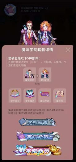 我想其中最受人欢迎的还是要数套装系列了吧,前期的箱子都不贵,还能够获得不同的装饰品,最最重要的是当你收集的部件达到一定的数量以后还可以获得称号哟(^U^)ノ~同时还可以通过做任务获得宝箱,开启就有一定几率获得部件,所以不管是氪金党还是白嫖党都会愿意去怼套装系列哒~那么今天就带大家来看看这一套【魔法学院】吧!