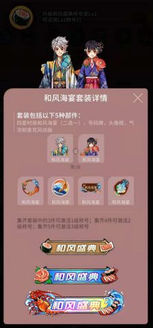 我想其中最受人欢迎的还是要数套装系列了吧,前期的箱子都不贵,还能够获得不同的装饰品,最最重要的是当你收集的部件达到一定的数量以后还可以获得称号哟(^U^)ノ~同时还可以通过做任务获得宝箱,开启就有一定几率获得部件,所以不管是氪金党还是白嫖党都会愿意去怼套装系列哒~那么今天就带大家来看看这一套【和风海宴】吧!